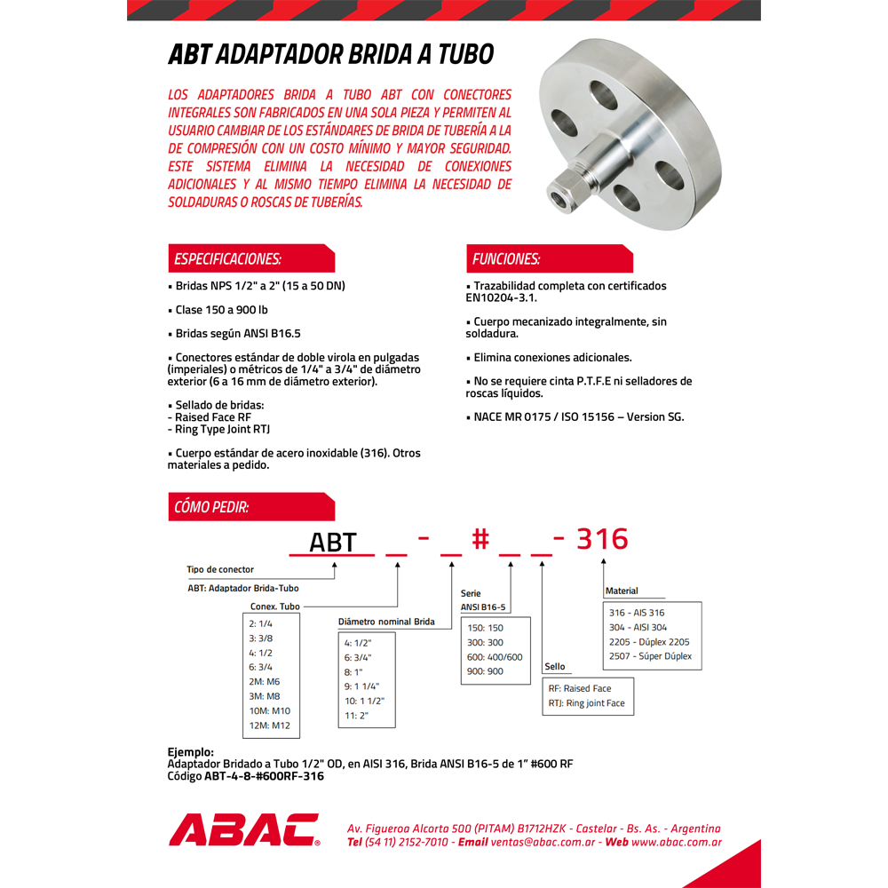 Los adaptadores brida a tubo ABT con conectores integrales son fabricados en una sola pieza y permiten al usuario cambiar de los estándares de brida de tubería a la de compresión.